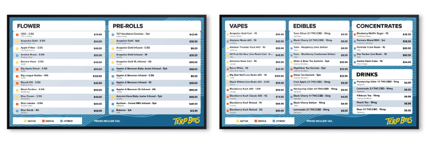 Our seamless integration with Dutchie ensures that inventory and product details on Terp Bros’ digital menus are updated immediately, guaranteeing accuracy and allowing staff to concentrate on educating customers rather than updating screens.